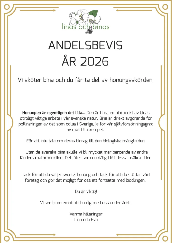 Vi är stolta andelsägare av bikupor i Skåne. Företaget Linas och binas biodling består av cirka 100 bisamhällen placerade på Linderödsåsen och Österlen.